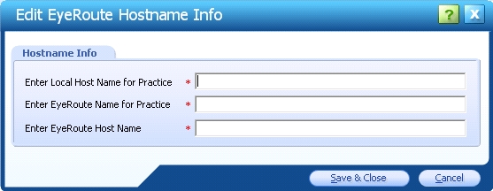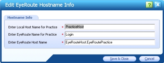 - The cursor is in the EyeRoute Local Hostname for Practice field.