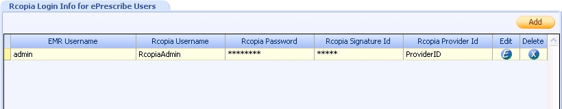 - Click the Add button on the Rcopia Login Info for ePrescribe Users tab.